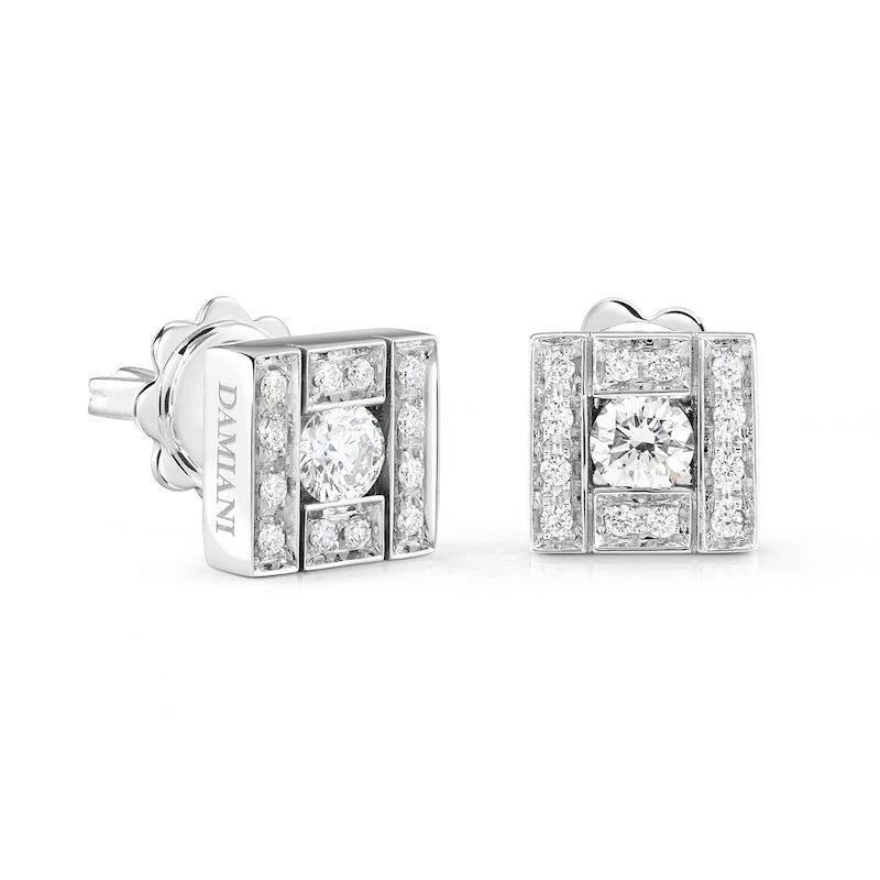 Очарованный энергией Belle Époque и прогрессом, который привел к появлению кинематографа, Энрико Грасси Дамиани создал ювелирную коллекцию, ставшую легендой на все времена. Кадры кинопленки послужили вдохновением для создания коллекции Belle Époque, выполненной в форме прямоугольников и кругов с бриллиантами, сапфирами, рубинами и изумрудами, которые чередуются между собой, создавая эффект динамичности. Серьги из белого золота с бриллиантами 0.30 Ct.
